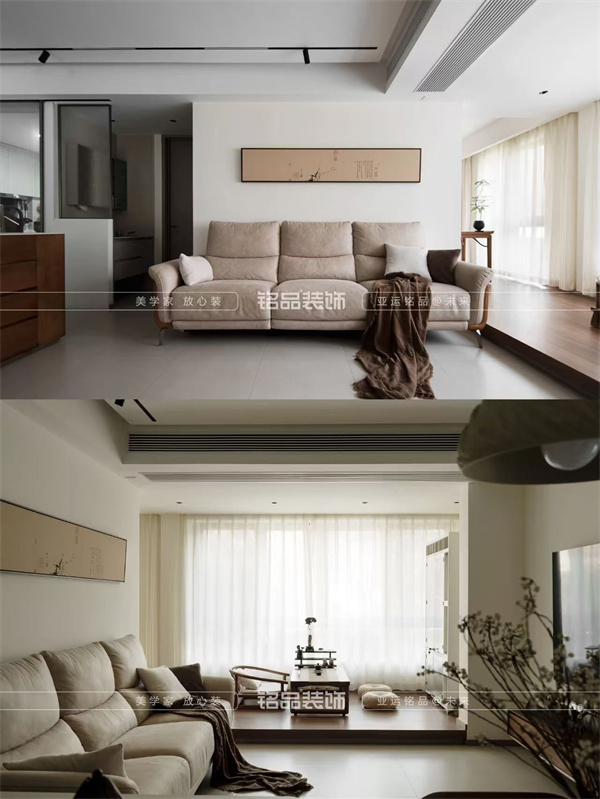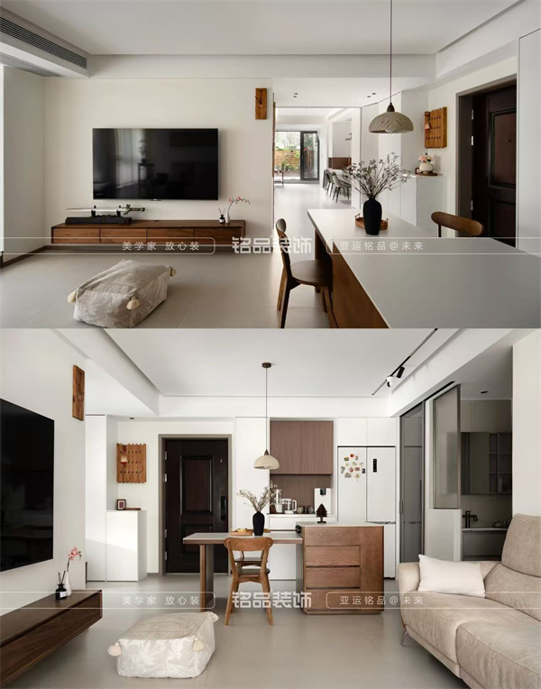 空间摒弃了传统中式的浓墨重彩,转而采用一系列柔和的中性色阶。素白为主色调,原木与深褐的家具点缀,没有强烈的视觉冲击,却营造出优雅温馨又自然脱俗的氛围。就如同春日里的阳光,不刺眼,却能将每一个角落都温柔照亮,让归家的人,瞬间卸下一身疲惫,沉浸在这份静谧的美好中。