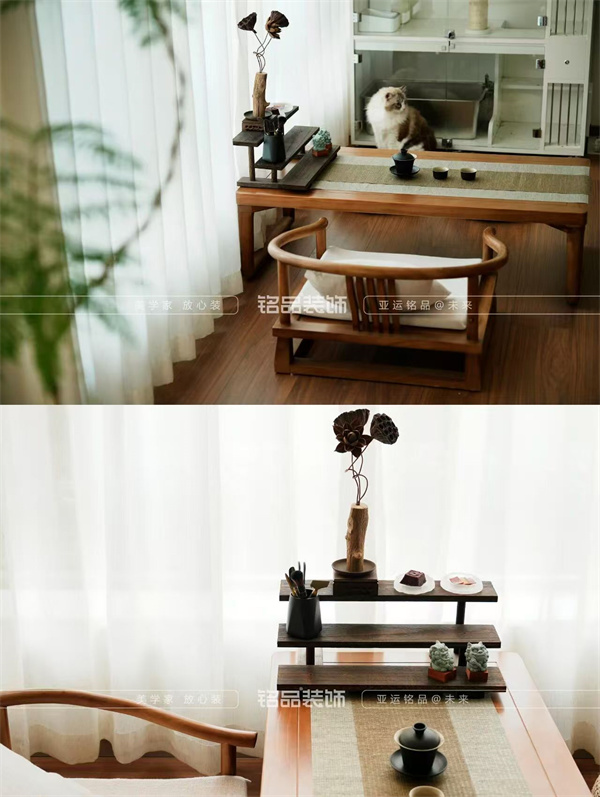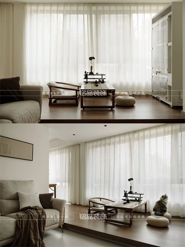 杭州中天珺府装修将原阳台拆除包进客厅,打造成休闲地台,茶台静静摆放,地毯温柔铺开,男主人可在此烹茶品茗;女业主喜爱的猫猫,在这也有了专属的猫柜,人与猫的互动,为空间增添了几分生动与暖意。透过客厅的落地大窗户,庭院的春夏秋冬尽收眼底,四季的风景成了家中最美的装饰画。原次卧则改为多功能书房兼客卧,提升空间利用率,再以一道可完全敞开的立川折叠门连接室内与庭院,让空间瞬间变得通透且富有变化。