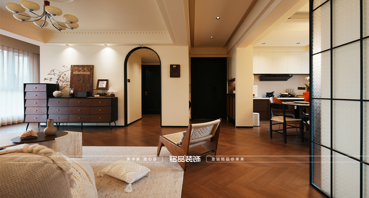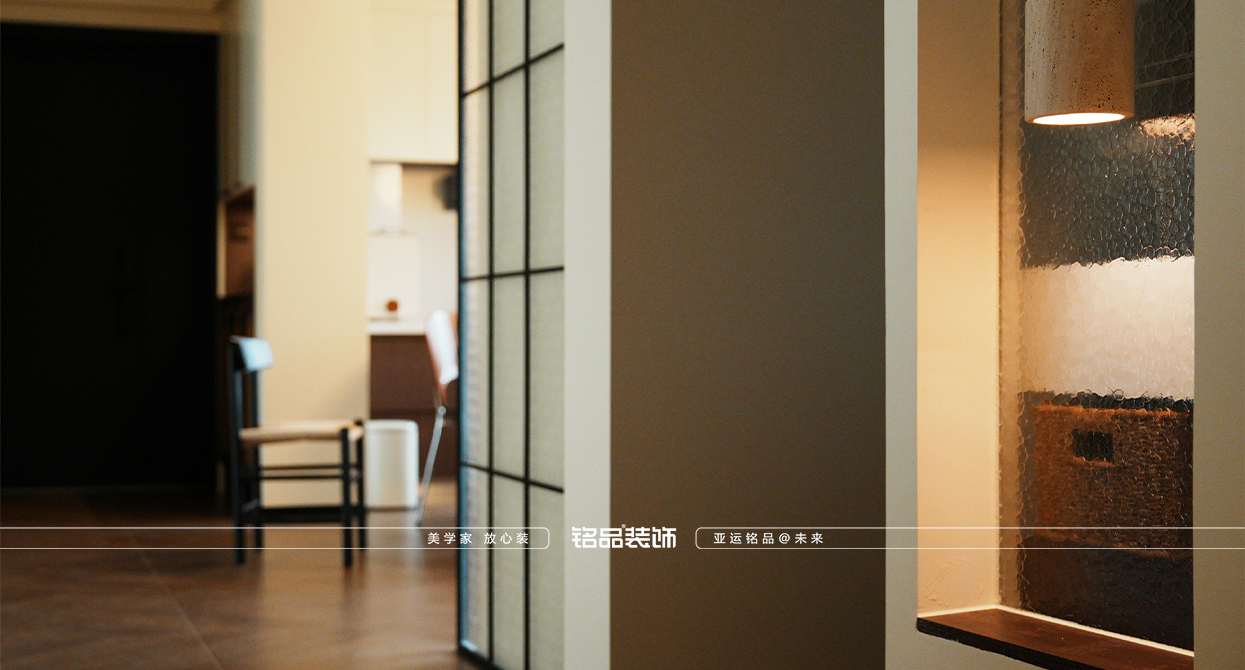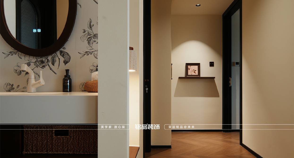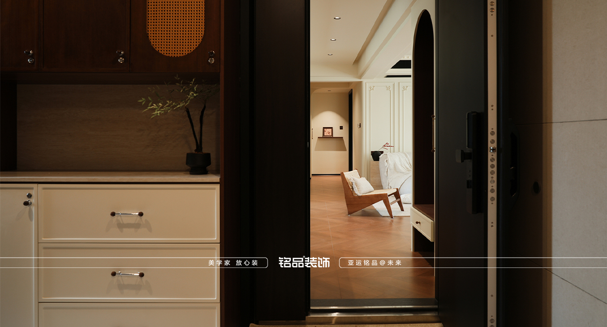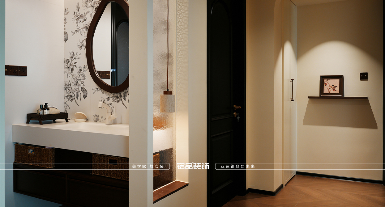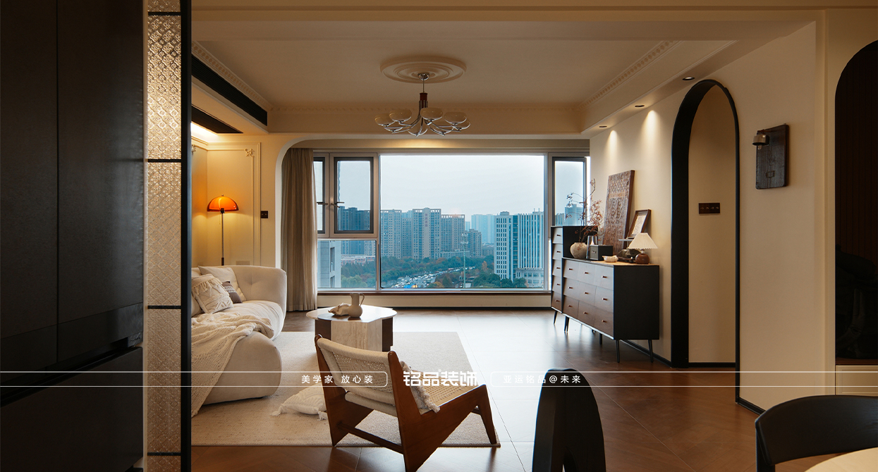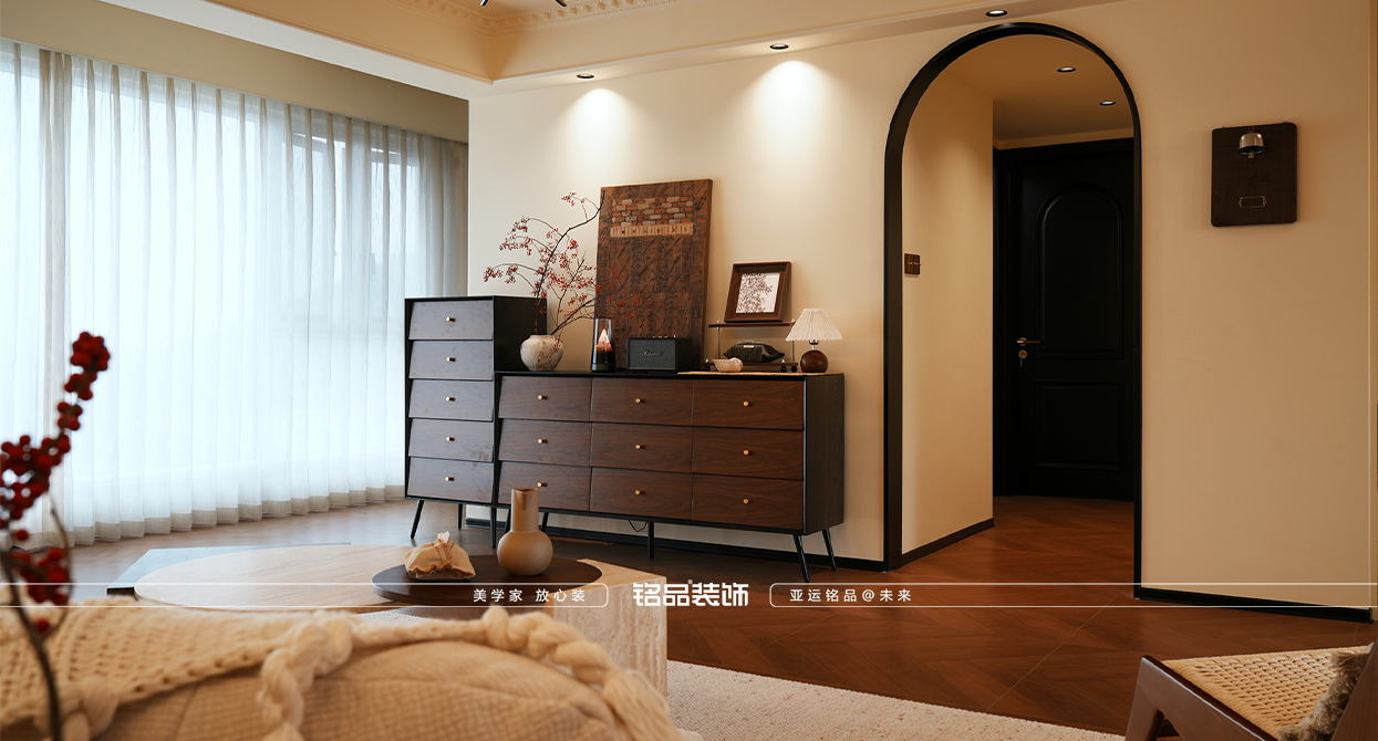 本案中古风整个空间的色彩策略就像建立一种"柔和中见力度“的关系,大面积使用都饱和度的柔和色系作为基调,营造安稳包容的氛围而深色则作为视觉焦点和重音精准的出现关键位置,以形成张力,拉出空间的纵深与层次感