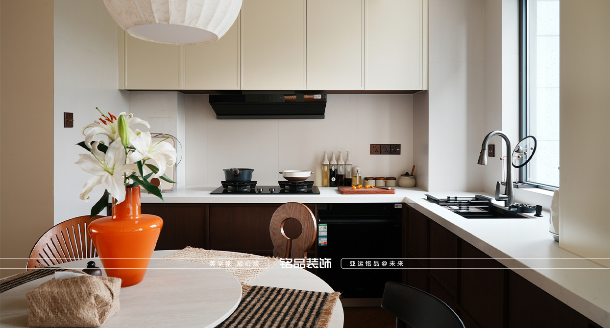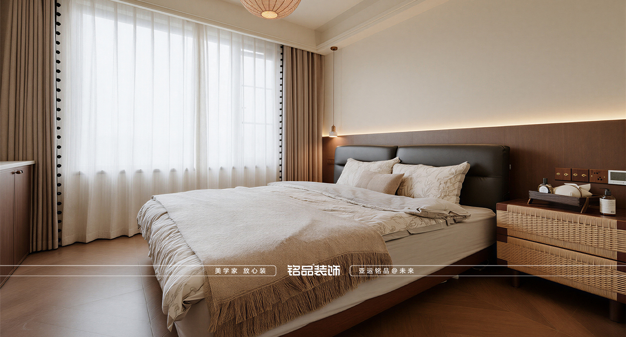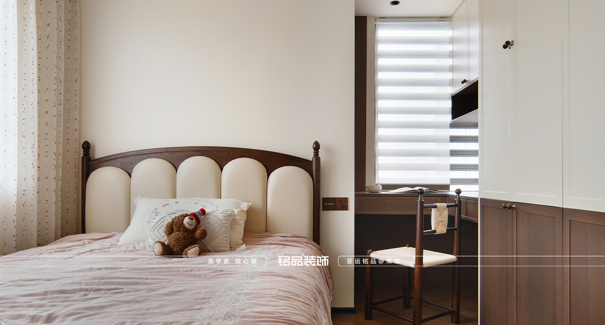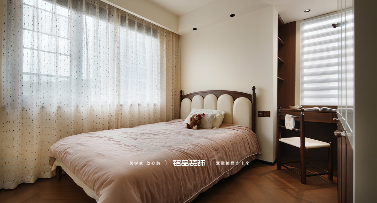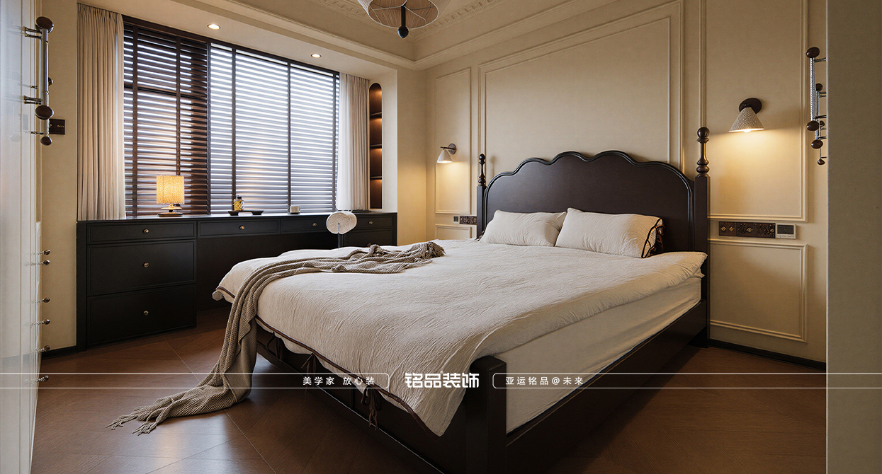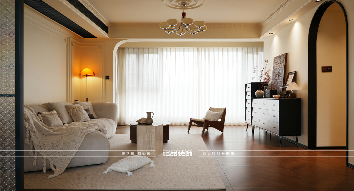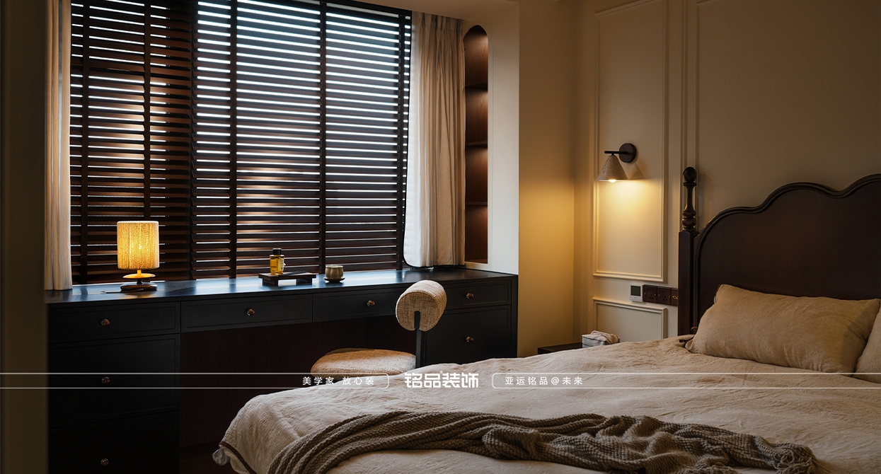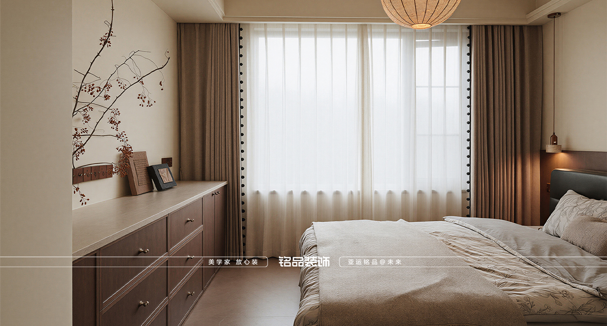 本案中古风整个空间的色彩策略就像建立一种"柔和中见力度“的关系,大面积使用都饱和度的柔和色系作为基调,营造安稳包容的氛围而深色则作为视觉焦点和重音精准的出现关键位置,以形成张力,拉出空间的纵深与层次感