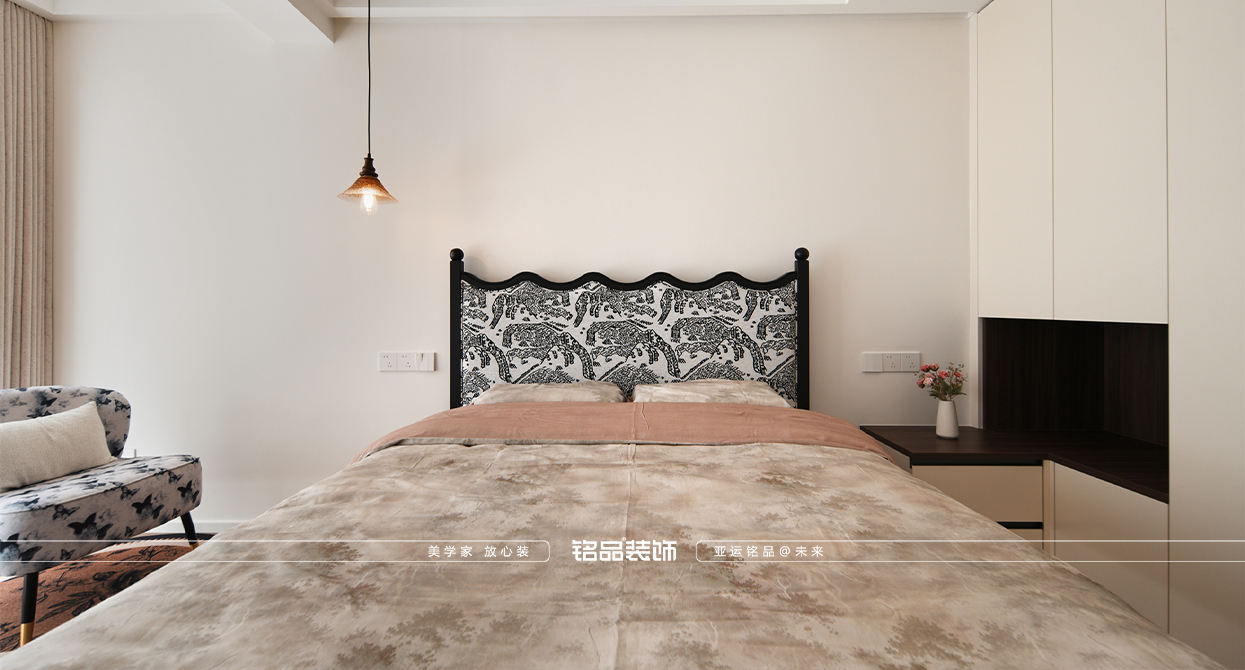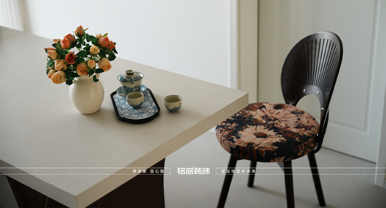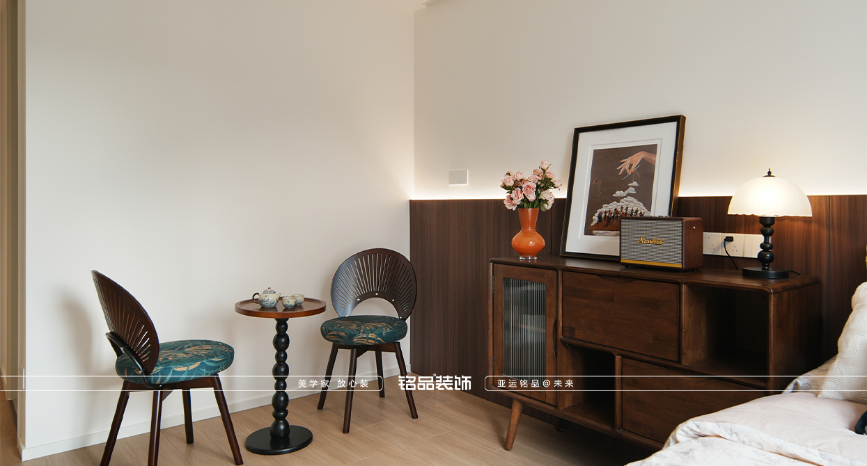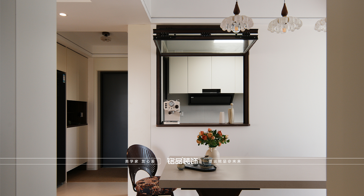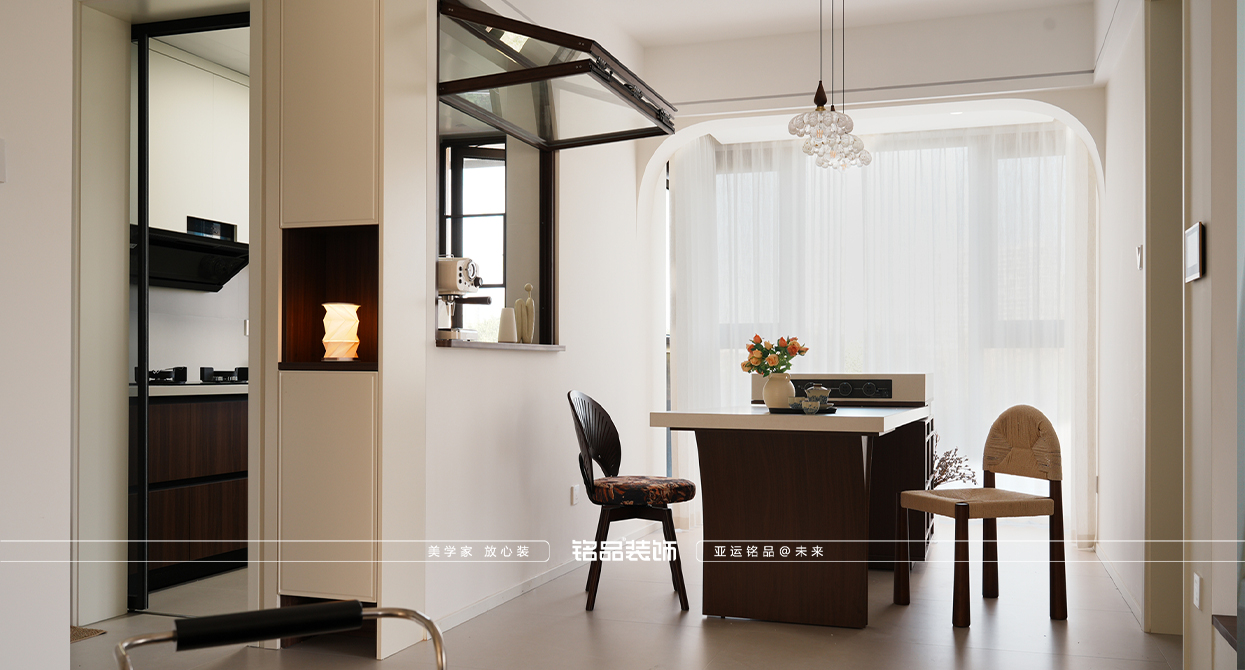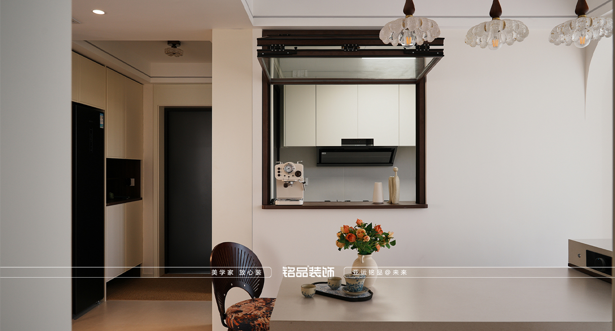 乾韵华庭这套新装修的房子以新老迭代为核心设计理念,旨在营造一个既复古又现代的居住环境。餐厅的岛台与餐桌一体化设计,不仅提升了空间的功能性,还增强了家庭成员间的互动,使得烹饪与用餐变得更加便捷和愉悦。厨房的折叠窗设计巧妙地打破了传统厨房的封闭感,增加了与家人的交流机会,也使得在厨房操作的同时能关注到家里老人的动向,确保安全。同时也让空间感得到延伸,使得整个居住空间更加通透和开放。主卧的双床设计考虑到了对老人的照顾需求,既方便了日常的护理,又保证了居住的舒适性和私密性。整体设计在满足现代生活需求的同时,也体现了对传统文化的尊重和传承。