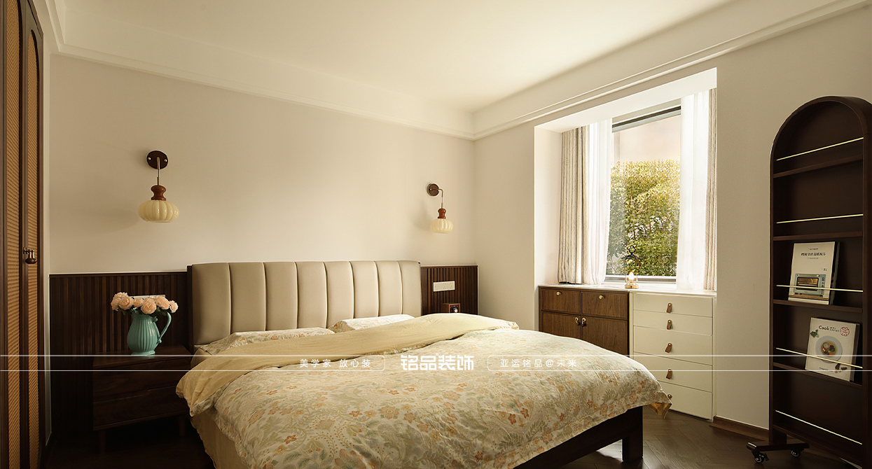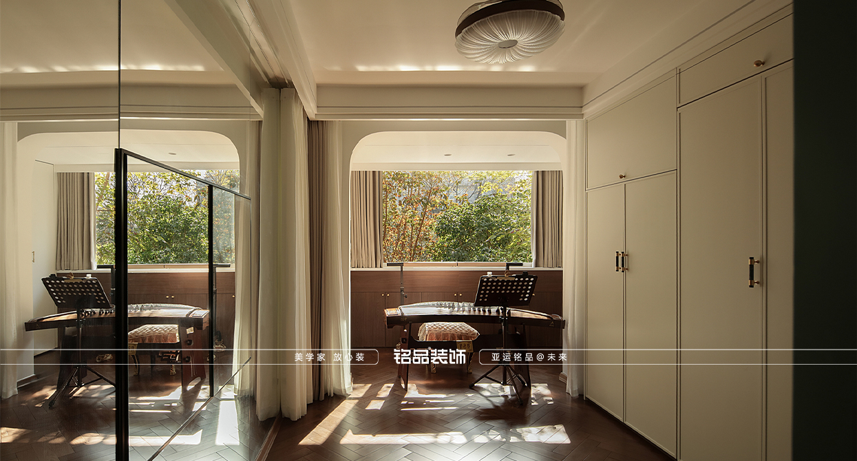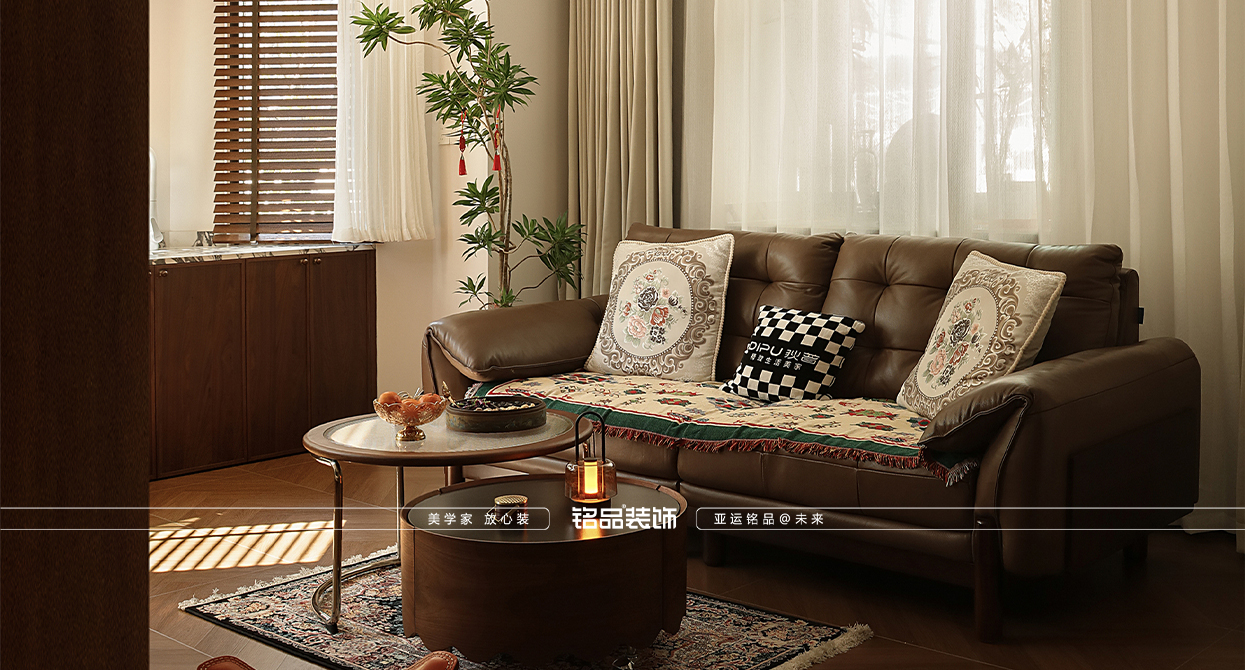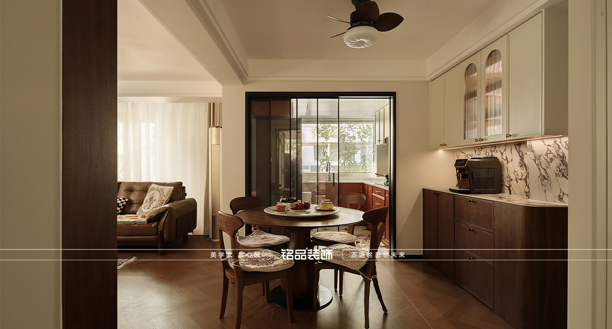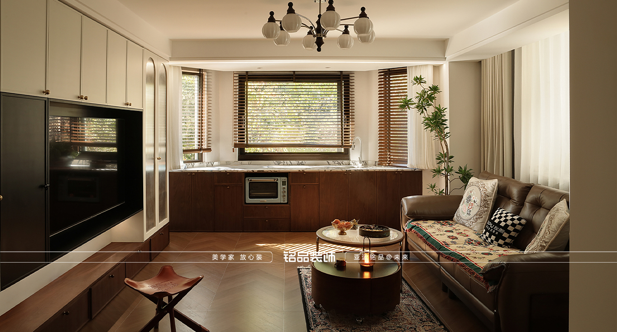 清怡花苑装修中古复古风格,有品有内核,石材用了宝格丽2.0厚度做单层岩板,客厅用了胡桃木地板砖,定制柜用黑胡桃木与浅色柜板,加部分的圆弧木饰面,层高无优势所以都是保留原顶做了造型灯具烘托中古风格。做了大面积的收纳空间符合业主的收纳需求,颜色素雅重色,体现平层空间的面积延伸