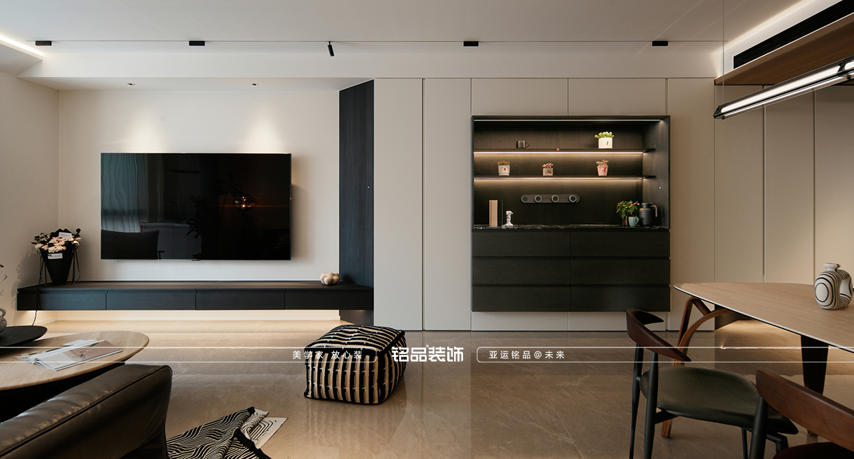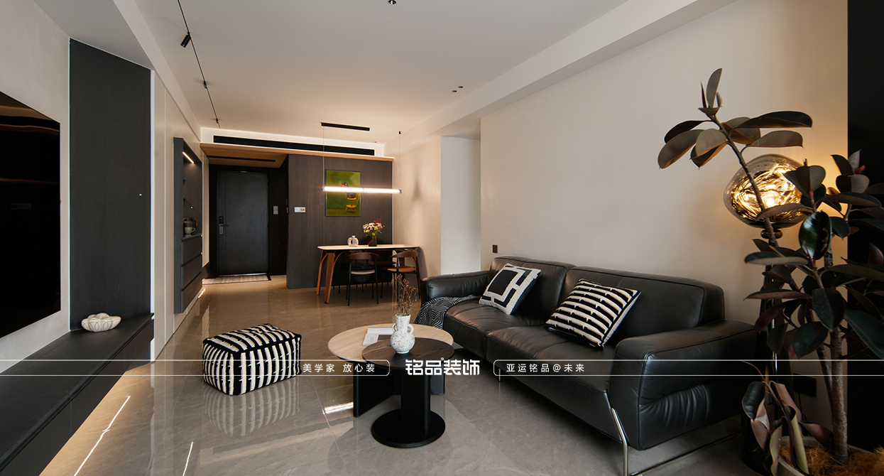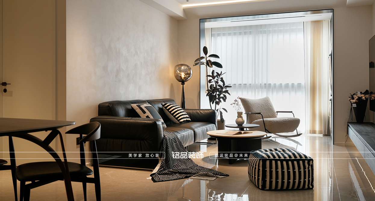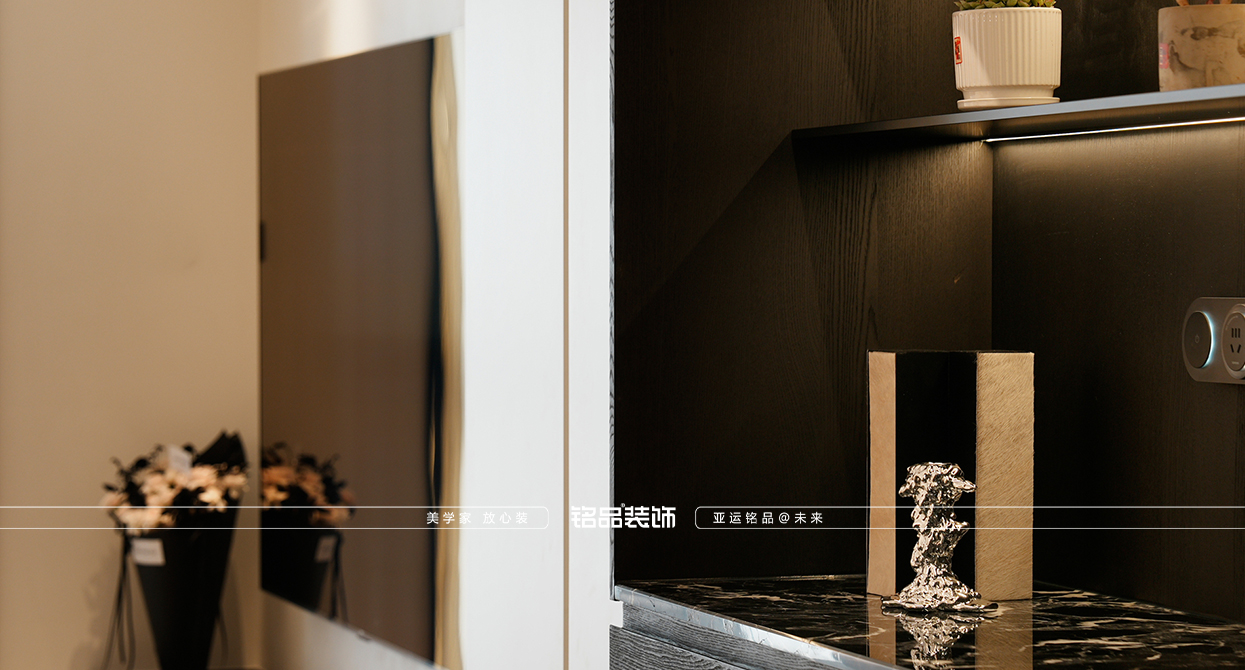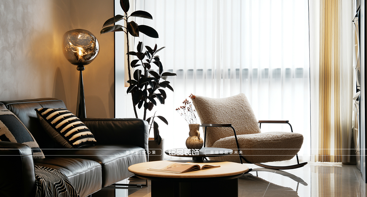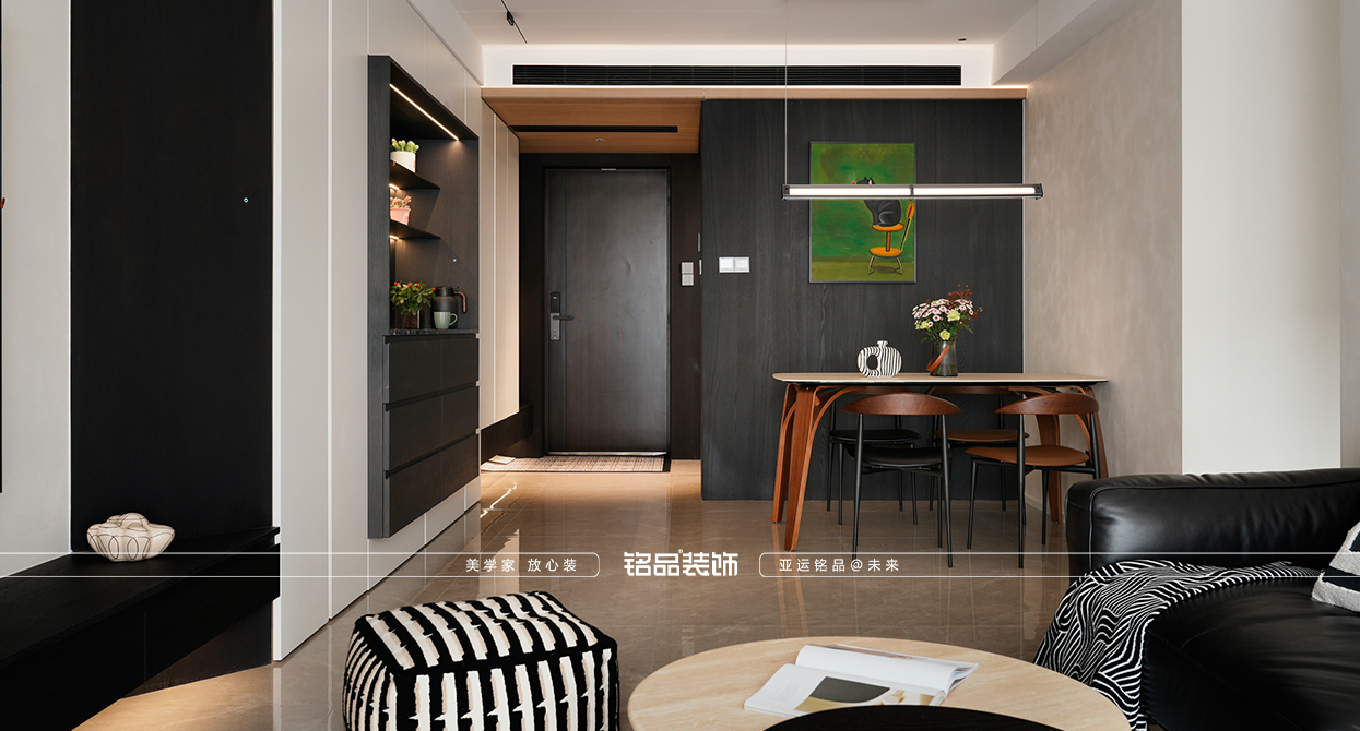 杭州拱墅区春樾星宸装修用黑白设计凸现代和永恒的特点,用黑白颜色的对比凸显空间的层次感,设计以简约和功能性为核心,将黑色主题贯彻到底。