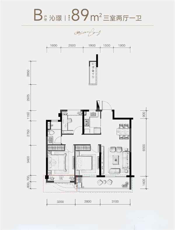 B户型/ 89㎡三室两厅一卫