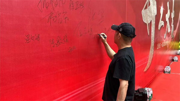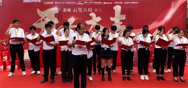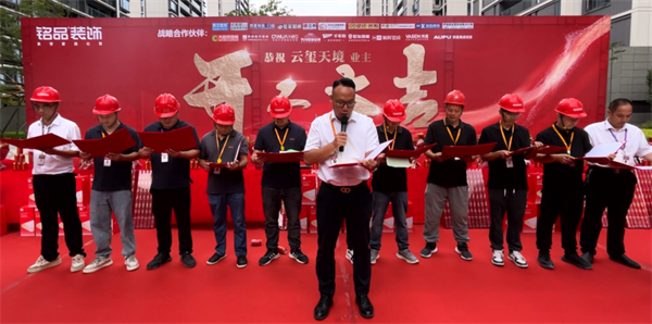 紧接着,品牌合作商、工程团队、设计师、销售集体宣誓,他们整齐排列,神情庄重,右手握拳高举,齐声宣誓: