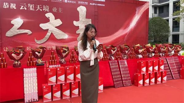 在领导们精彩的致辞后,陈女士作为业主代表怀着激动的心情上台分享:“我们对比了很多家,最终选择了铭品。从最初的沟通到方案的设计,铭品团队的专业和耐心让我们非常满意。相信在铭品的帮助下,我们一定能拥有一个温馨、舒适的家!” 业主代表的真诚分享,让现场的氛围更加温馨,也让铭品人更加坚定了服务好每一位业主的决心。