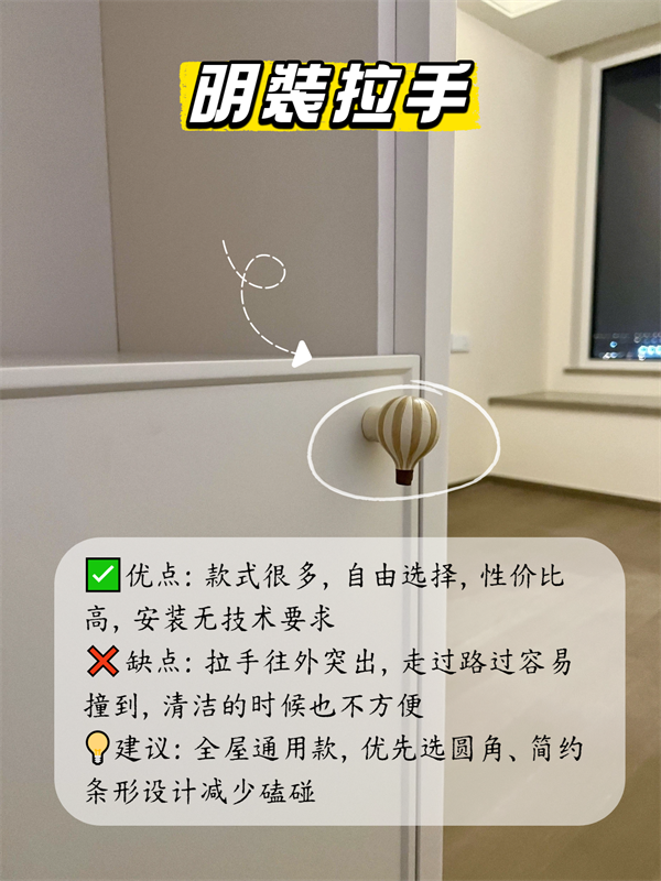 侧重实用安全:明装拉手(选圆角款)或内嵌拉手是更稳妥的选择。