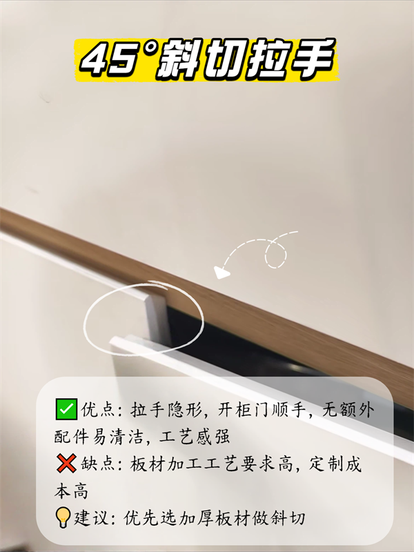 核心优点:利用柜门板自身做斜切处理,实现半隐形效果,无突出物,不易磕碰且便于清洁,工艺感强。
