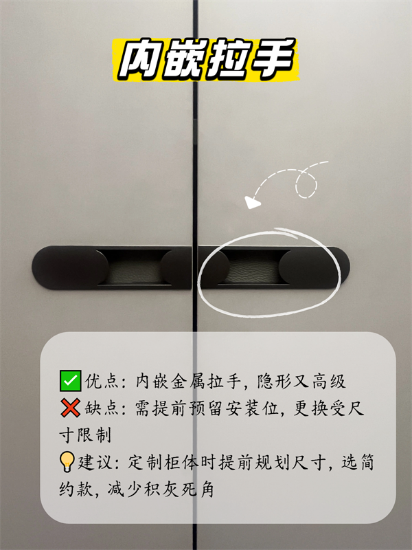 核心优点:将拉手嵌入柜门边沿,仅微有凸起,兼顾了简洁外观和顺手的开合体验,磕碰风险低。