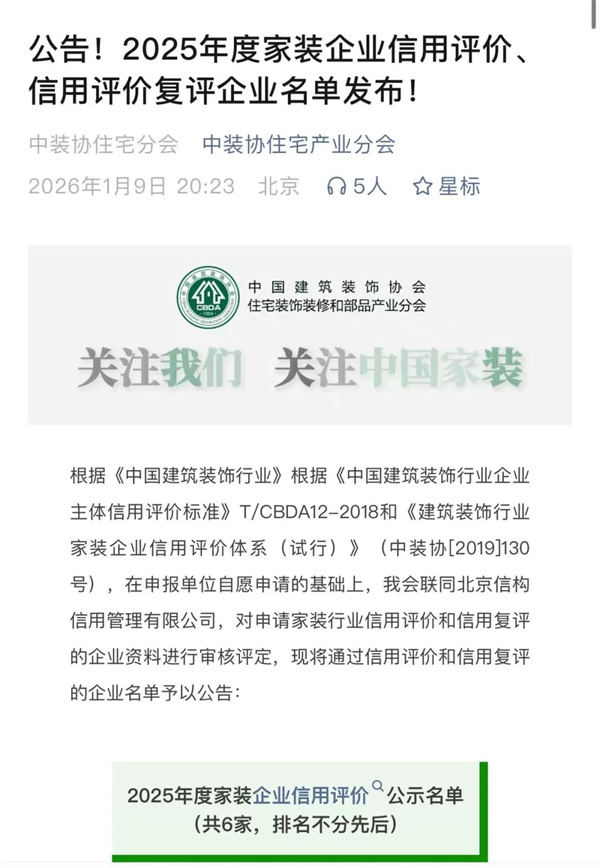 中国建筑装饰协会住宅产业分会正式揭晓2025年度家装企业信用评价结果,
