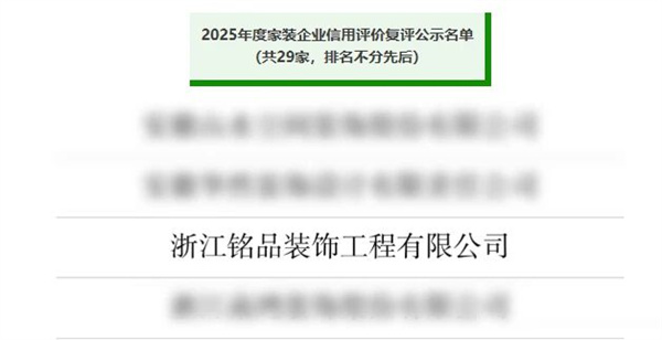 铭品装饰再次凭借卓越的综合实力与坚实的信用体系,荣登榜单。