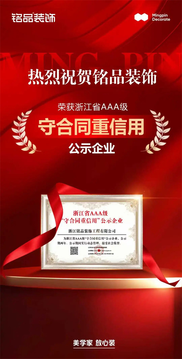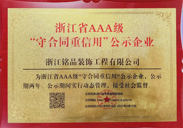 近日,浙江省市场监督管理局正式公示2025年度“守合同重信用”企业名单,铭品装饰凭借卓越的诚信体系和合同管理能力,再次获评浙江省AAA级“守合同重信用”企业。这一荣誉不仅是对铭品装饰长期坚持诚信经营的官方认可,更是企业品牌信誉的重要里程碑。